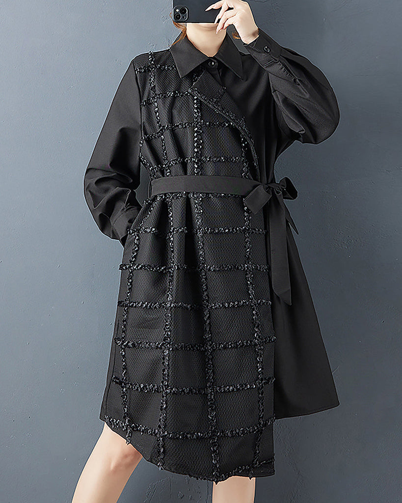 ellazhu Women's Dress Coat Lapel Long Sleeve Tie Waist Casual Maxi Plus Size Pocket Patchwork Irregular Hem GZ689 Black
