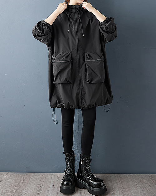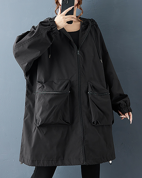ellazhu Women's Coats Hooded Windbreaker Solid Long Sleeve Zip Up Plus Size Side Pockets GZ704 Black