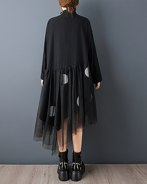 ellazhu Women's Dress Lapel Button Down Mesh Patchwork Long Sleeve Plus Size Irregular Hem GZ714 Black