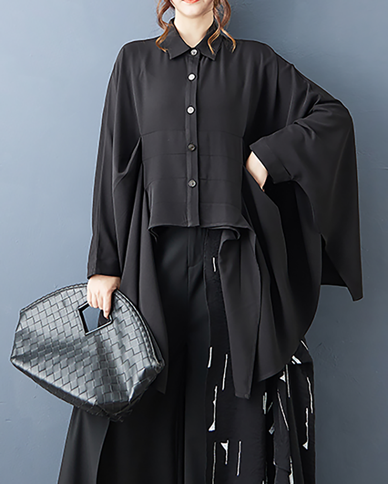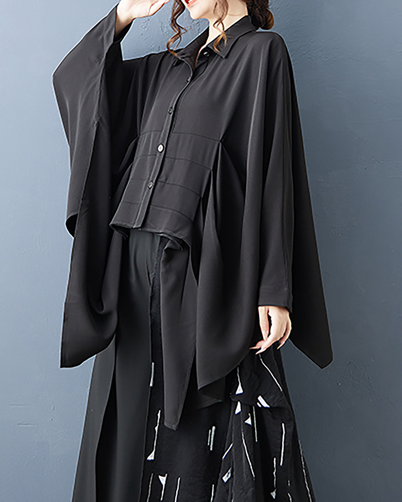 ellazhu Women's Shirt Button Down Lapel Batwing Long Sleeve Solid Irregular Hem Loose Oversize GZ656 Black