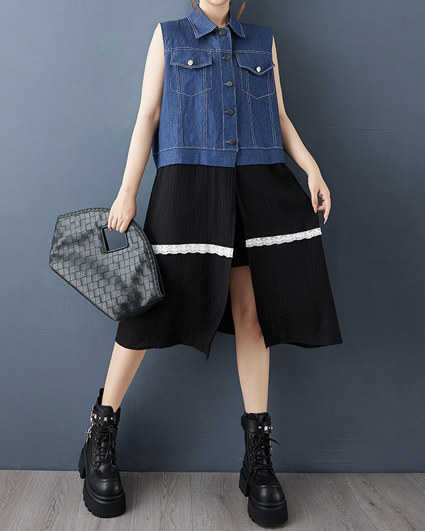 •Features: This women's vest dress features the lapel design and lace element for a sophisticated and trendy look.And the sleeveless and button-down design can keep us cool and fashionable.What's more,split hem and demin patchwork create the charming and fashion silhoute.The whole dress can be worn in the daliy life and casual occassion.