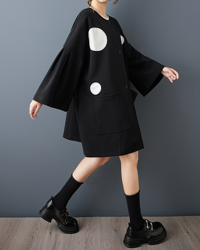 ellazhu Women's DressCasual Crewneck Black Long Batwing Sleeve Polka Dot Printed Oversize Flowy Hem GZ621 Black