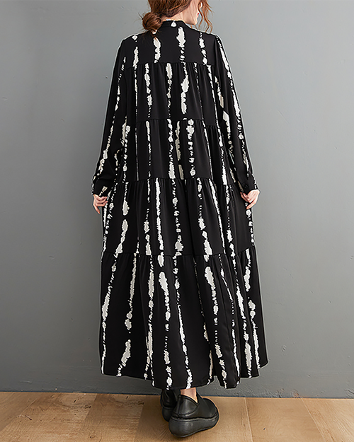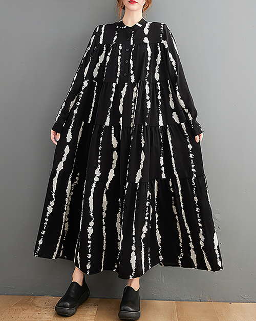 ellazhu Women's Dress Casual Mock Neck Long Sleeve Oversize Button Down Printed Long Maxi Hem Side Pockets GZ623 A Black