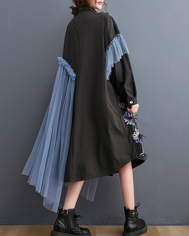 ellazhu Women's Dress Vintage Elegant Lapel Long Sleeve Oversize Patchwork Embroidered Flowy Hem Button Down GZ631 Black