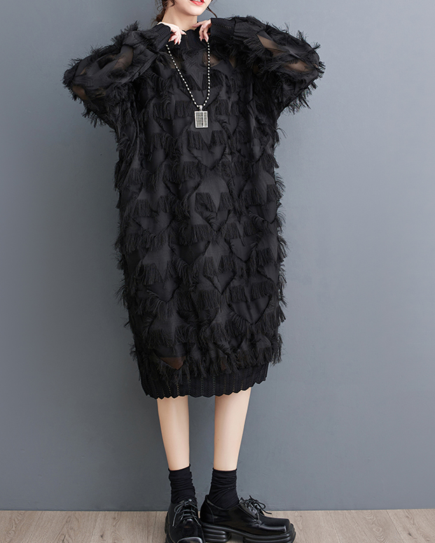 ellazhu Women's Dress Long Sleeve Oversize Split Hem Mesh Midi Length Black Solid GZ634 Black