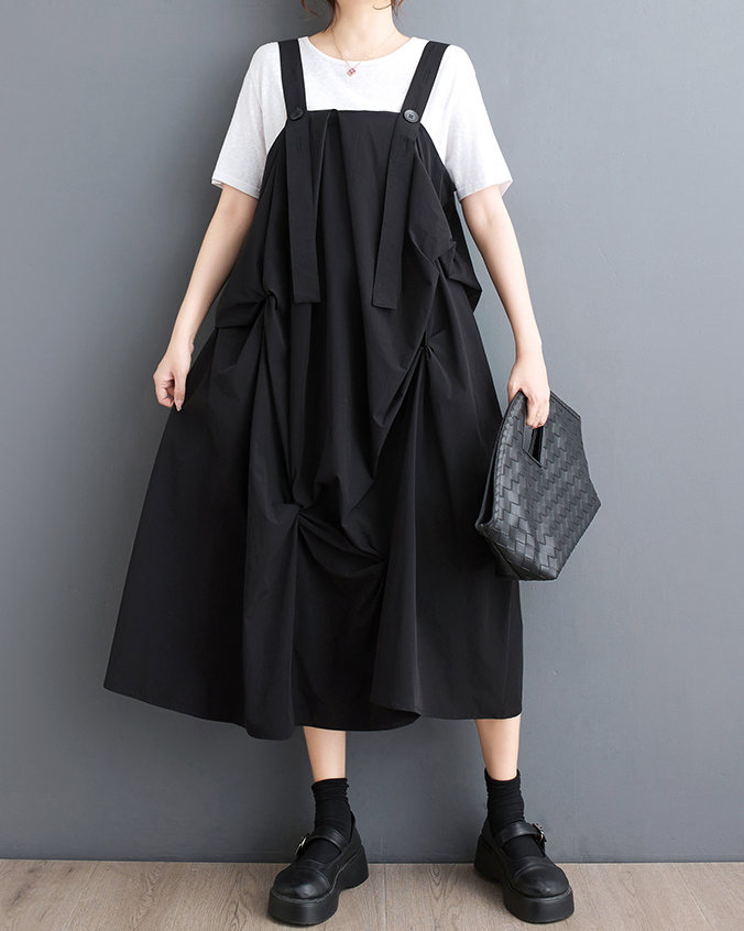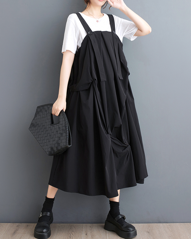 ellazhu Women's Dress Casual Suspender Sleeveless Oversize Side Pockets Long Maxi Hem GZ642 Black