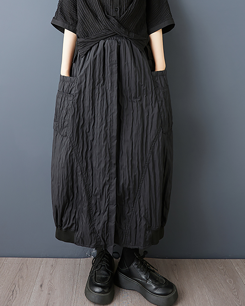 ellazhu Women's Skirt A-line Loose Oversize Pleated Elastic Waist Casual Long Maxi Hem Side Pockets GZ652 Black