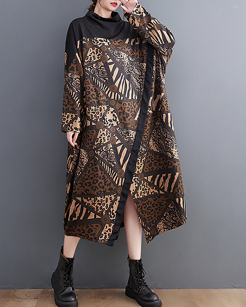 ellazhu Women's Dress Casual Mid Length Mock Neck Long Sleeve Oversize Printed Split Hem GZ663 Black