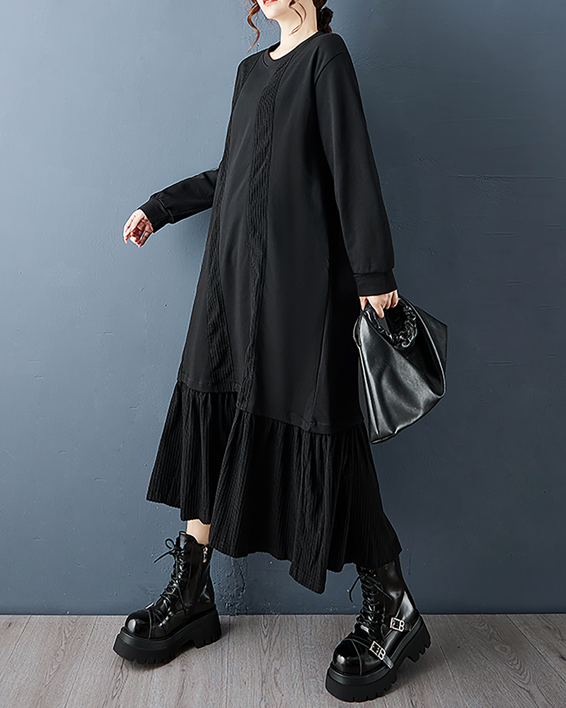 ellazhu Women's Dress Casual A-line Crewneck Long Sleeve Oversize Solid Long Maxi Hem Side Pockets GZ682 Black