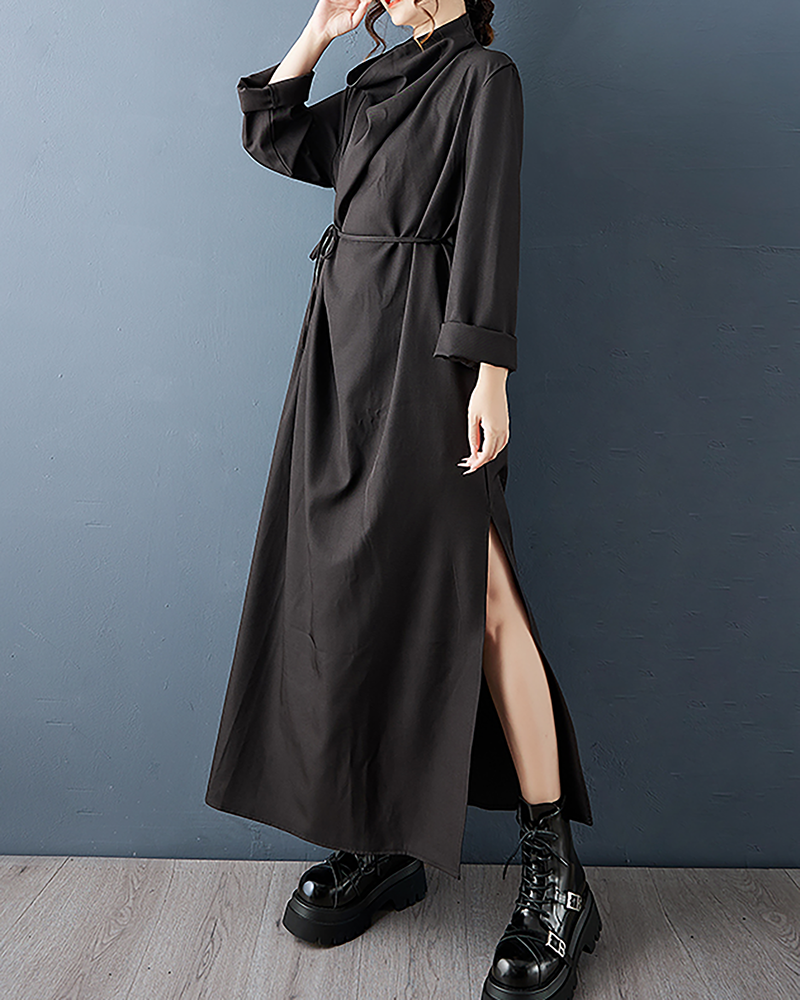 ellazhu Women's Dress Casual Turtleneck Long Sleeve Tie Waist Oversize Solid Split Hem Side Pockets GZ683 Black